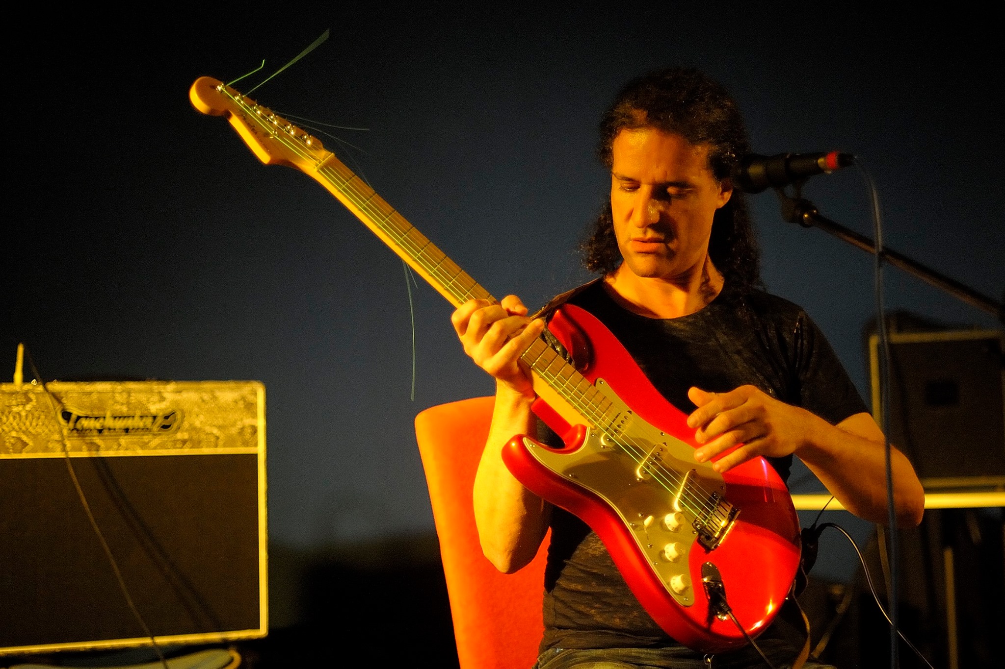 Das Archiv für populäre Musik im Ruhrgebiet e.V., Dortmund, veranstaltet seit einiger Zeit spannende Konzerte, insbesondere im Bereich Improvisierte Musik und Avantgarde im „Evinger Schloss“. Der algerische Musiker D. Laroussi trat in diesem besonderen Rahmen im kleinen Saal als Solist auf, spielte E-Gitarre, Gumbri und sang. Nicht nur dass er es meisterhaft versteht, die Musik Nordafrikas, insbesondere der der Gnawa (frz.:Gnaoua) mit Elementen von Pop und Jazz zu veschmelzen, er ist zudem ein charismatischer Sänger, der charmant durch das Programm führte und nebenbei die Verwandtschaft von Blues und Gnawa Musik demonstrierte. Mit live eingespielten Loops verdichtete Laroussi seine Songs, zu den Riffs sang er oder brillierte mit raffinierten Linien auf seiner Fender Stratocaster.