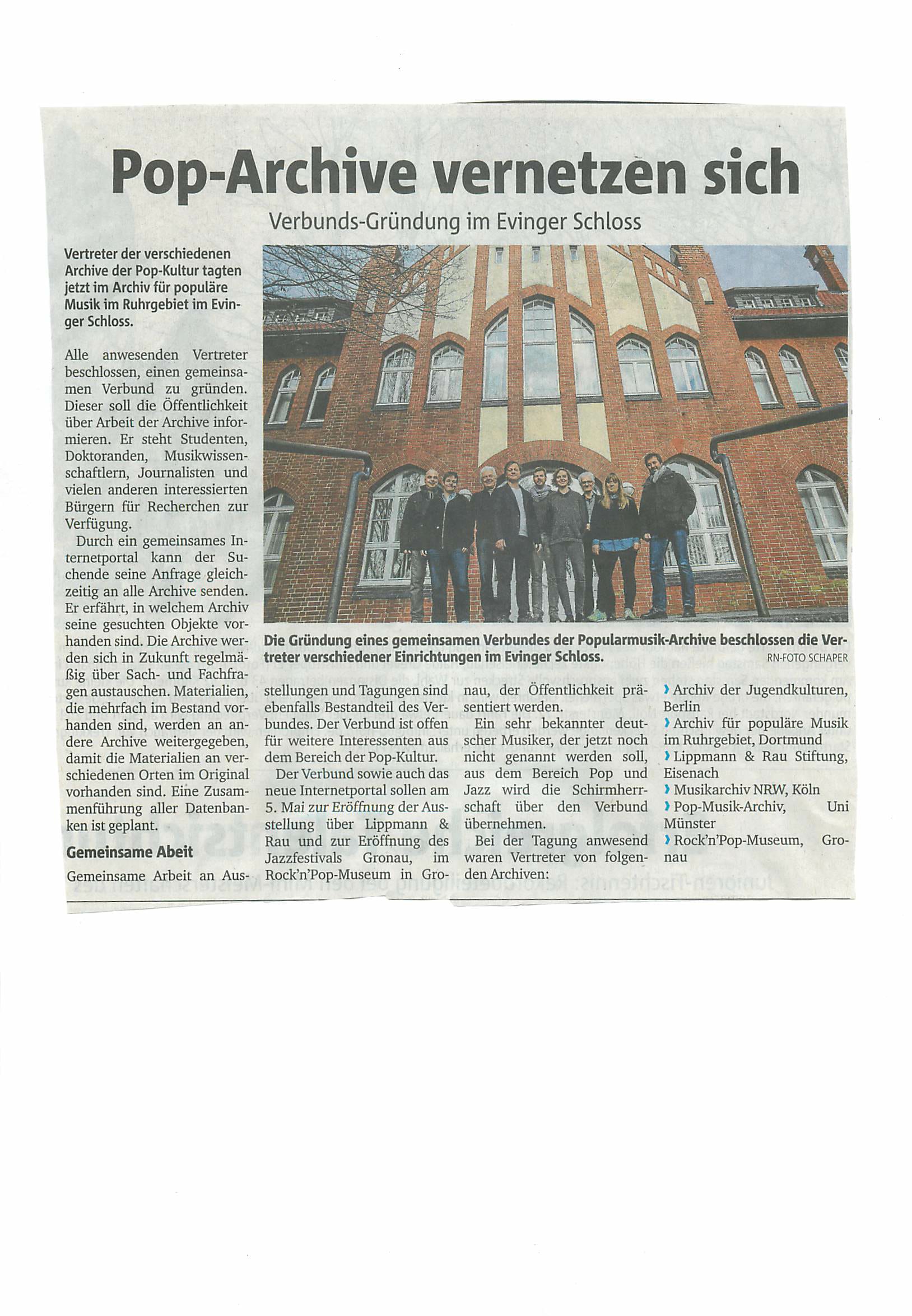 Deutschlands Archive populärer Musik und Kultur gründeten einen Verbund im Evinger Schloss Veröffentlicht am 25. Januar 2017 von Archiv für populäre Musik im Ruhrgebiet e.V. Am 19. Januar trafen sich bei uns diverse Archive populärer Musik und Kultur bei uns im Evinger Schloss zu einer konstituierenden Sitzung zur Gründung eines Archivverbundes. Die Ruhrnachrichten waren dabei. Teilen mit: Klicke, um auf X zu teilen (Wird in neuem Fenster geöffnet) X Klick, um auf Facebook zu teilen (Wird in neuem Fenster geöffnet) Facebook Gefällt mir Wird geladen … Ähnliche Beiträge