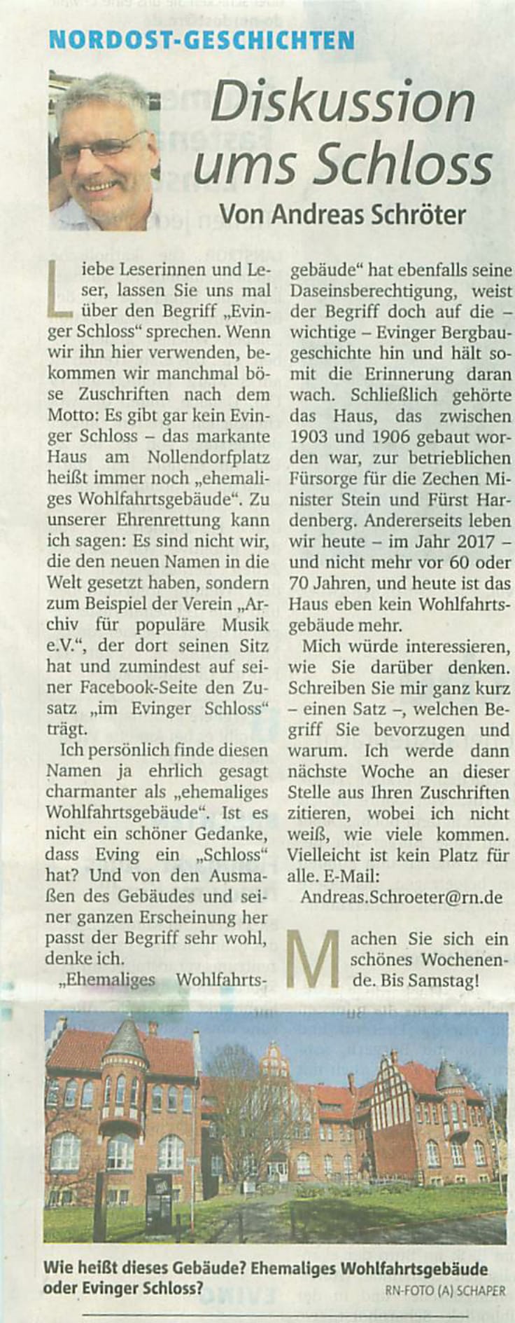 Es ist zwar kein wirkliches Schloss in dem wir arbeiten, aber immerhin ein „Kulturschloss“. Der Name wäre m. E. auch besser für unseren Ort – „Evinger Kulturschloss“.