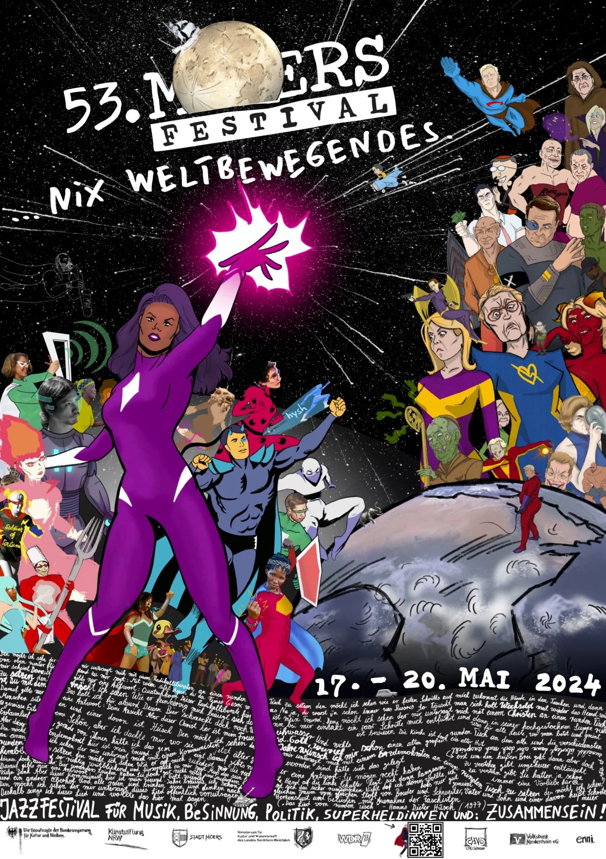 Das MOERS FESTIVAL, das aus der 68er-Bewegung heraus entstanden und sich seiner Wurzeln sehr bewusst ist, ist mehr als abgedrehte Musik und Trommelkreise im Freien. Es ist, „gefälligst ein Lebensgefühl“! Bei der Pressekonferenz im März gibt der Künstlerische Leiter Tim Isfort einen Vorgeschmack auf das Pfingstwochenende. Nix Berauschendes erwarte sein Publikum, so behauptet er, während das Festivalbüro, die Kreativschmiede, in der Ideen entstehen, nach Kirschblüten duftet. Dann präsentiert sein Team ein Plakat, das im Cartoon-Style daherkommt, und auf dem der geneigte Betrachtende jede Menge Schurken erkennen kann, die die Welt zu überrennen drohen, doch ihnen gegenüber stehen Artists aus aller Welt, die sich Pfingsten ´24 in Moers treffen werden, um zumindest für vier Tage das Böse zurückdrängen. Mit diesem Plakat kann man sich stundenlang beschäftigen, raten und natürlich auch diskutieren. Nicht nur olfaktorisch, grafisch und musikalisch wollen Isfort und sein Team die Gäste erreichen. „In einer Zeit, da die Schere überall weiter auseinander geht, politisch, gesellschaftlich und finanziell, dürfen wir nicht verlernen, miteinander zu reden, versöhnlich zu sein, und dabei klare Haltung zu zeigen,“ so Isfort. Dafür sorge eine fiktive Person, die in diesem Jahr 99 Jahre alt würde, die mit klugen, politischen und manchmal kabarettistischen Aussagen immer wieder auftaucht, und eventuell nicht allein der Phantasie entsprungen ist, sondern dem echten Leben entlehnt sei. Warum die Person immer auf einem weißen Schiff daher kommt, verrät Isfort nicht, hofft aber, dass alle Besucherinnen und Besucher das folgende Gefühl in die Zeit danach mitnehmen: „und alle reden und trinken essen und denken nach Herzenslust und Gelüsten mit Ausnahme der Faschisten.“