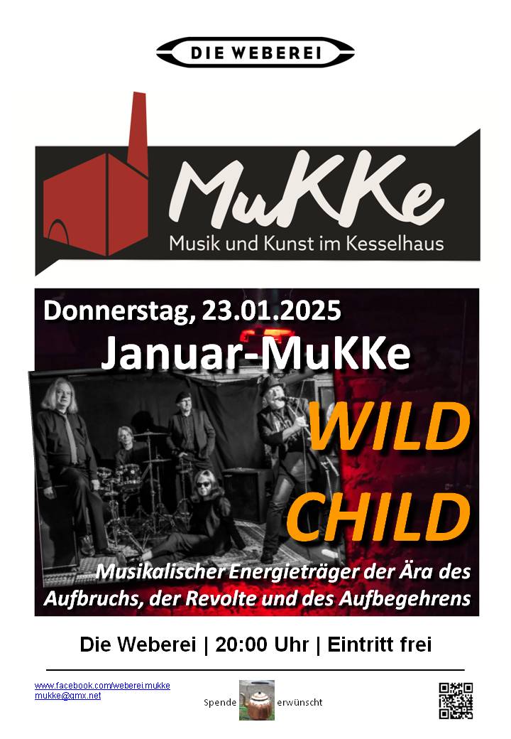 Eine besondere Band mit einer besonderen Setlist – einzigartig auf der Szene. WILD CHILD versteht sich nicht als Cover-Act, sondern vielmehr als Energieträger der Zeit der Rebellion und des Protests der 60er Jahre. WILD CHILD ist überzeugt, dass die Songs, die sie ausgewählt haben, unbedingt live auf die Bühne gehören, um das Publikum mit auf eine unvergessliche Zeitreise zu nehmen. WILD CHILD haben der Energie wegen, eine Vorliebe für Garage & Psychedelic, für Bands wie Them, The Wheels, The Music Machine, The Litter, The Banshees, The Chocolate Watchband, The 13th Floor Elevator, The Kinks, Love, The Pretty Things, The Doors, Van Morrison Patti Smith, Roky Erickson, uvm. Die großartigen Musiker der Band sind: Rosel, Guido Schlösser, Dietmar Gahsche, Helmut Meyer und Thomas Hopf. Das Programm wird moderiert von Hans Schreiber, Leiter des Archivs für populäre Musik in Dortmund.